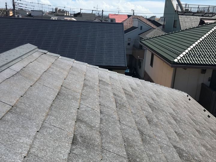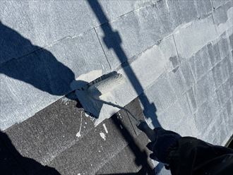 損傷部については火災保険を使用して部分的な補修を行うと共に、屋根材が全体的に表面剥離を来たしていたので、この機会にと言う事で屋根全体の塗装工事としてご依頼頂きました。