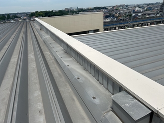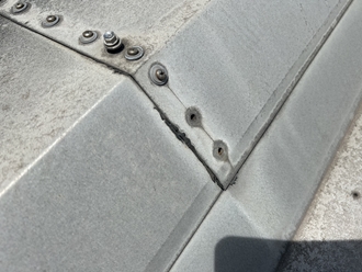 折板屋根にはパラペット下の雨押え板金にビス固定されておりましたが、こちらが緩んでしまい度々補修工事を行うなどお困りになられておりました。真夏などの温度が原因ですのでブリッジシール工事を行うご提案をさせていただきました。